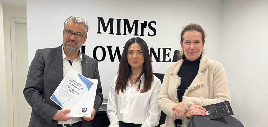 Bürgermeister Matthias Schmidt und die Gewerbevereinsvorsitzende Beate Seibert-Simon gratulierten herzlich zur Eröffnung und wünschten Mimi Rashid viel Erfolg und viele zufriedene Kundinnen und Kunden!